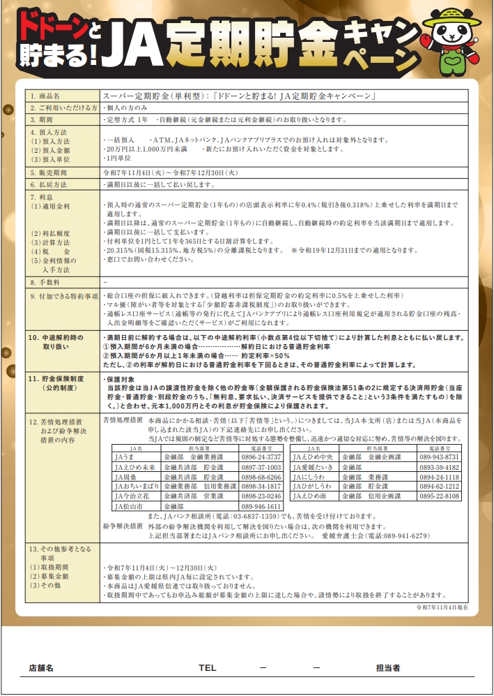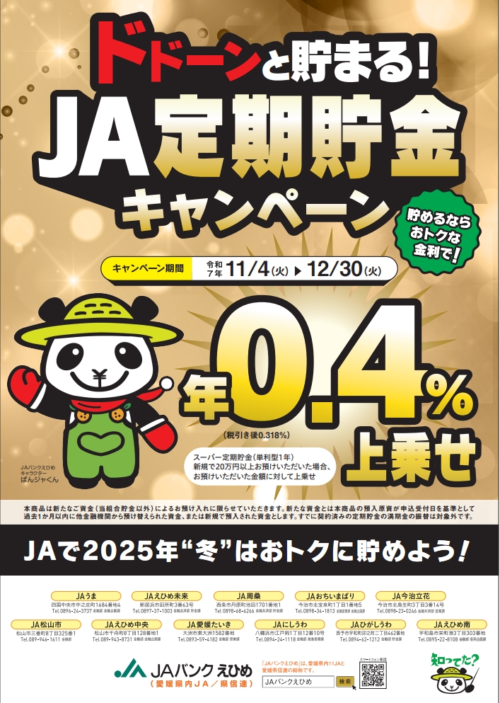 JAえひめ南では、期間限定で定期貯金キャンペーンを実施します。 1年もの定期貯金に、通常金利にプラス0.4%上乗せいたします!
